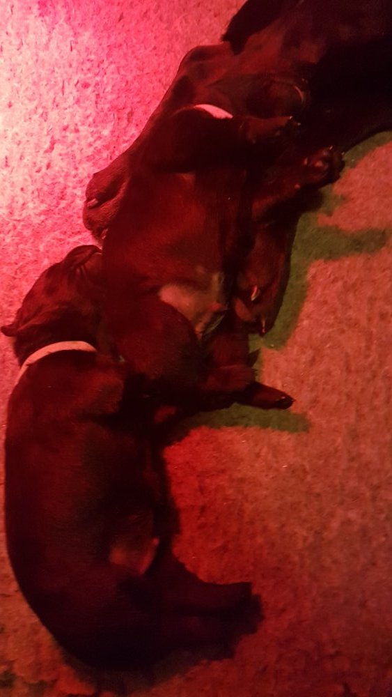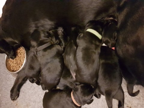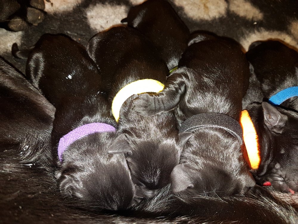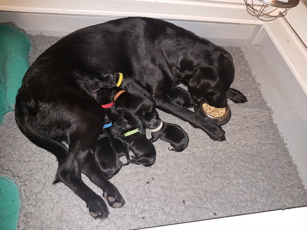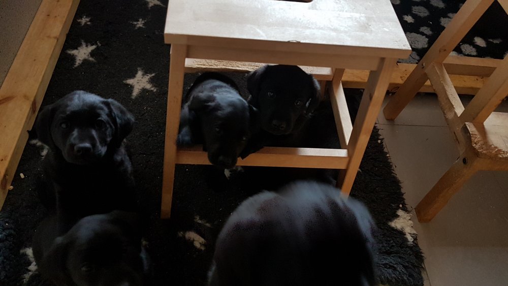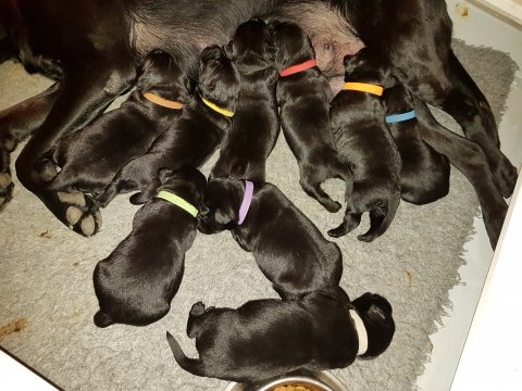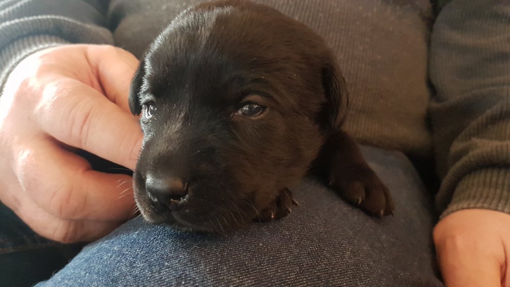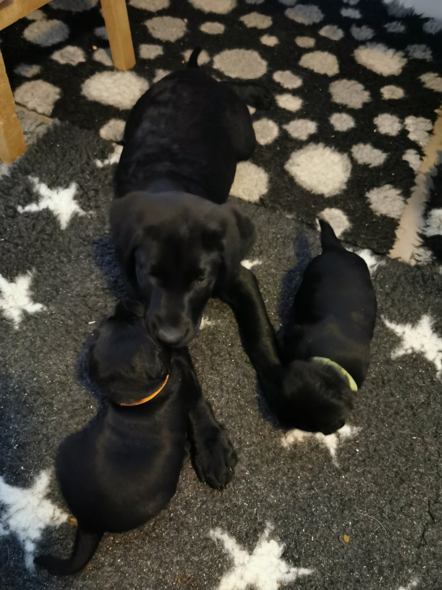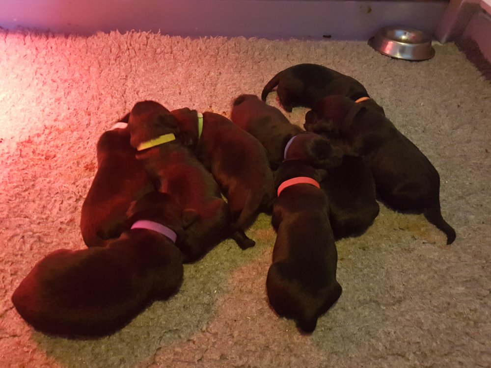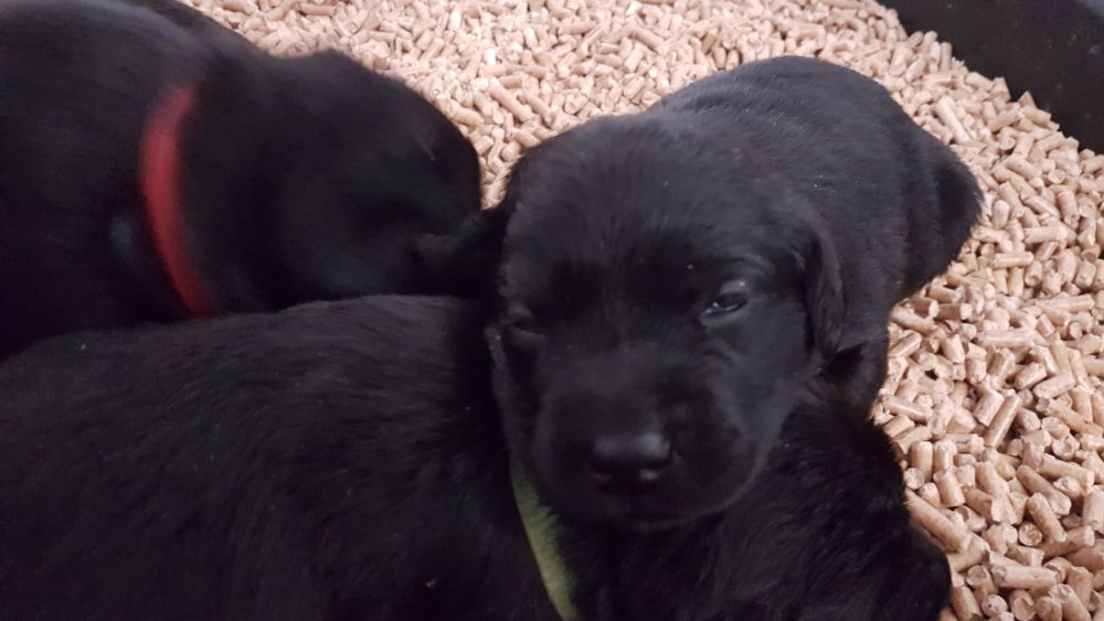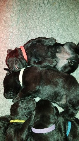 De har alle fået øjne og begyndt at bevæge sig rundt i kassen næsten som rigtig små hunde. De har også opdaget de andre hvalpe i kasse, så de er begyndt at "slåse" med hinanden. Her sidst på ugen er de begyndt at få opblødt hvalpefoder, som de alle spiser.