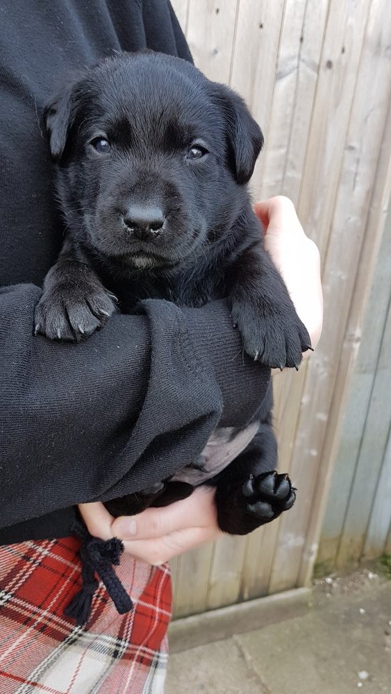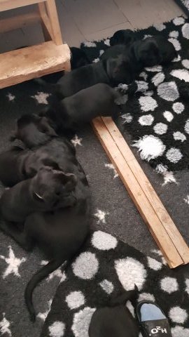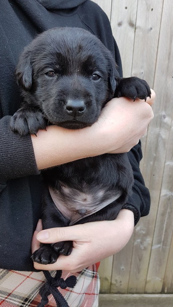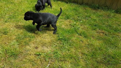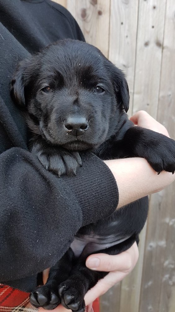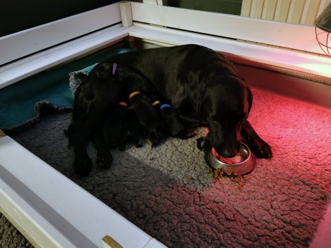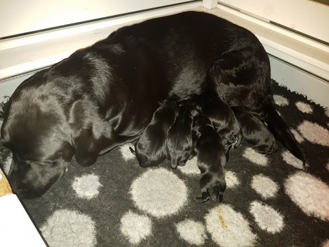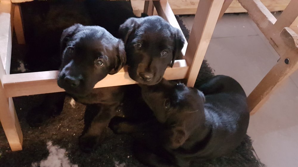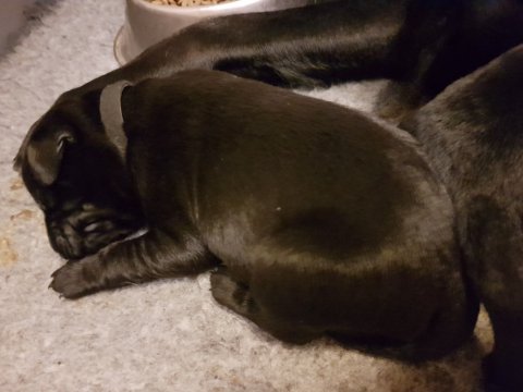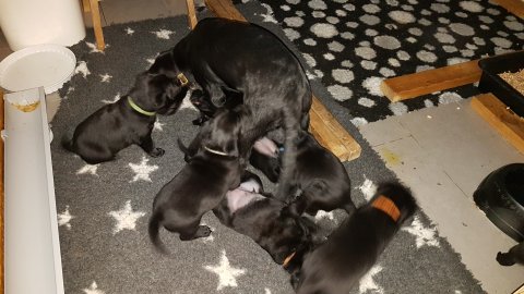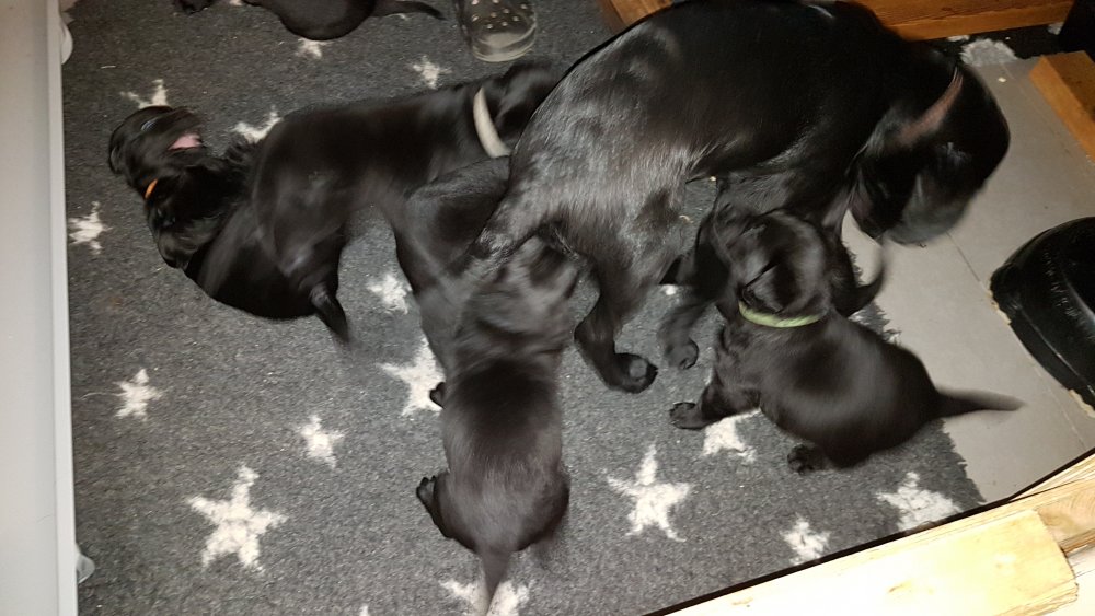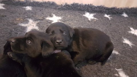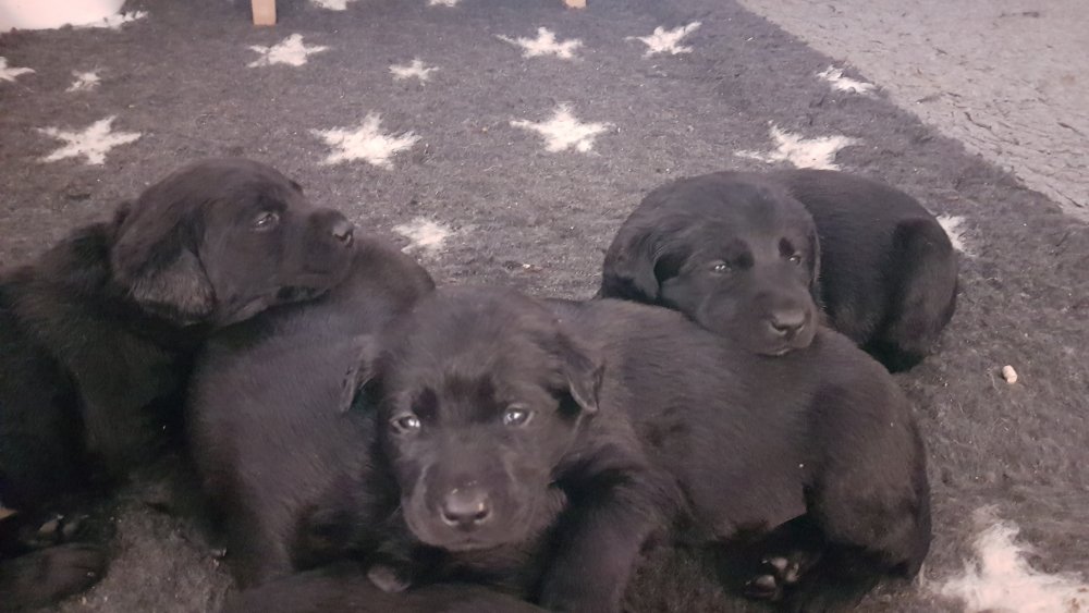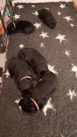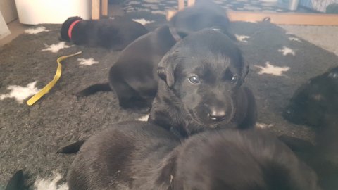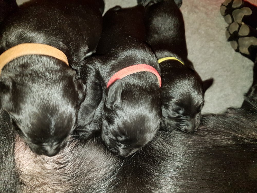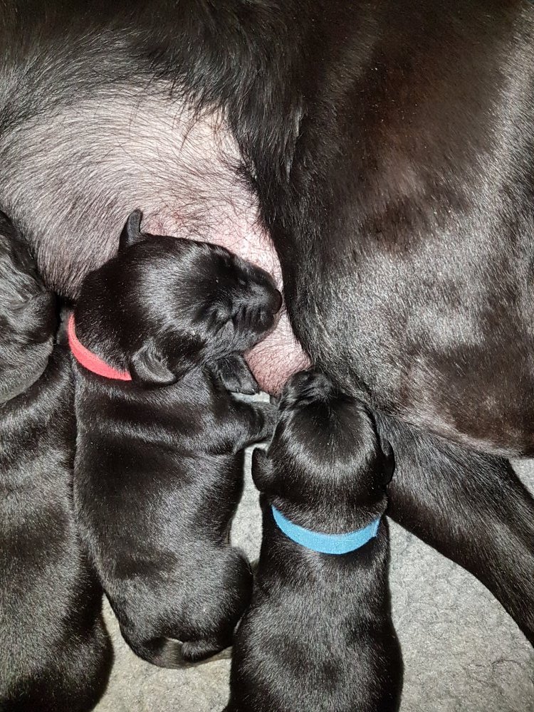 De har alle fået øjne og begyndt at bevæge sig rundt i kassen næsten som rigtig små hunde. De har også opdaget de andre hvalpe i kasse, så de er begyndt at "slåse" med hinanden. Her sidst på ugen er de begyndt at få opblødt hvalpefoder, som de alle spiser.