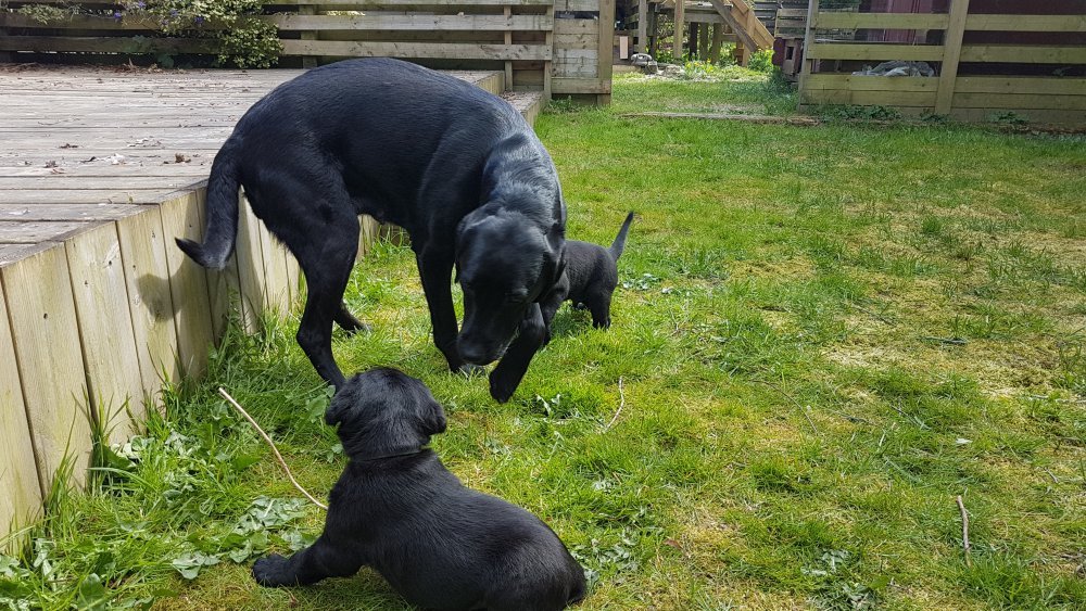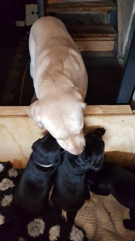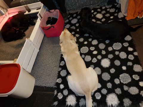 De andre hunde har også været inde og hilse på hvalpene.